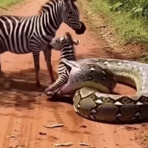 A dramatic wildlife scene has been captured on a dusty road, where a massive snake appears to have attacked a young zebra, clamping it in its jaws….